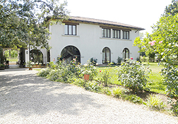Trois grandes portes à arcs mettent en communication le séjour avec le parc, dans lequel un espace peut être prédisposé pour des déjeuners en plein air quand la saison le permet. Des chaises et des tables de jardin sont mises à disposition.